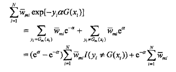 由此可知,被基本分类器误分类样本的权值得以扩大,而被正确分类样本的权值却得以缩小。两相比较,误分类样本的权值被放大