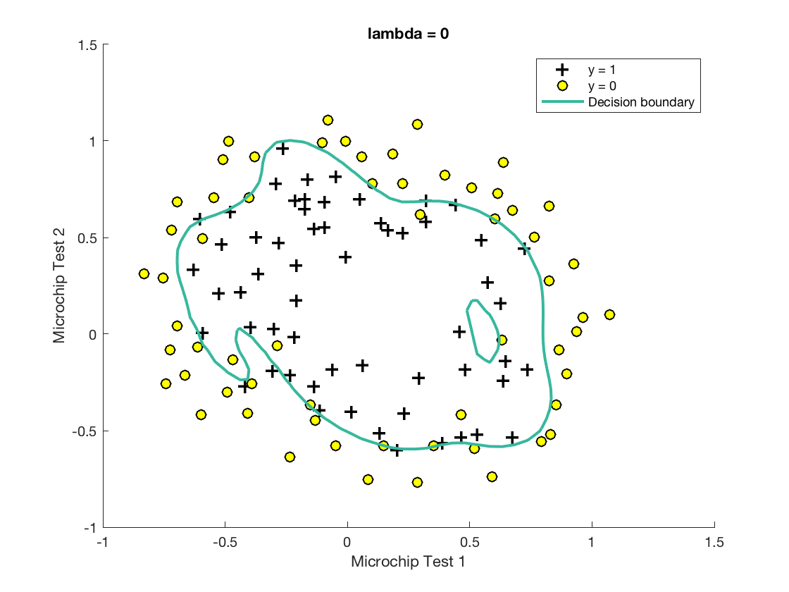 % Here is the grid range u = linspace(-1, 1.5, 50); v = linspace(-1, 1.5, 50); z = zeros(length(u), length(v)); % Evaluate z = theta*x over the grid for i = 1:length(u) for j = 1:length(v) z(i,j) = mapFeature(u(i), v(j))*theta; end end z = z'; % important to transpose z before calling contour % Plot z = 0 % Notice you need to specify the range [0, 0] contour(u, v, z, [0, 0], 'LineWidth', 2)